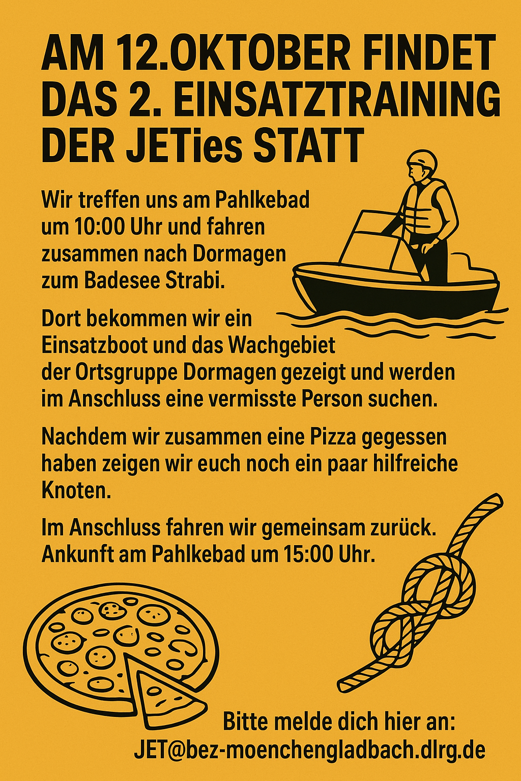 JET-Gruppenstunden: ca. alle 3 Wochen – wechselnde Themen wie Gerätekunde, Funk & Kommunikation, Erste Hilfe, Sanitätsübungen oder Team‑Events wie Film‑, Pizza‑ oder Spieleabend